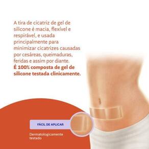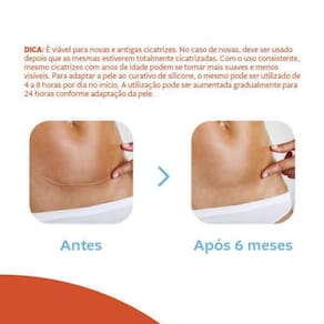 Curativo de silicone para cicatrização reutilizável 4cm x 15cm 4 unidades cremer Curativo de silicone para cicatrização reutilizável 4cm x 15cm 4 unidades cremer A tira de cicatriz de gel de silicone é macia, flexível e respirável, e Utilizado principalmente para minimizar cicatrizes causadas por cesáreas, queimaduras, feridas e assim por diante. É 100% composta de gel de silicone testada clinicamente. O gel de silicone pode manter a cicatriz úmida e limpa, desempenhando um papel de barreira física entre a cicatriz e o ambiente externo; sob sua ação, as cicatrizes serão gradualmente reduzidas. Ampla faixa de aplicação cicatrizes resultantes de cirurgias, lesões, queimaduras, cesárias e outras . Benefícios: - suaviza área com cicatriz - auxilia o processo de cicatrização, pois imita barreira natural da pele - reutilizável - fácil de aplicar Modo de uso: 1. Limpe e seque a área da cicatriz. 2. Corte a tira de acordo com o tamanho e formato da cicatriz. 3. Retire o revestimento do lado adesivo da folha. 4. Aplique o lado adesivo da folha diretamente na cicatriz. 5. O produto pode ser até que a face adesiva não cole mais. O curativo pode ser limpo com água morna e depois de seco. Armazenamento: conservar em ambiente fresco e seco, longe do sol. Atenção: não use em pele com rachadura, feridas abertas ou em superfícies de pele com secreções e crostas. Risco de asfixia: manter fora do alcance de crianças menores de 3 anos. Certifique-se de que as tiras foram removidas antes de aplicar. Em caso de eventual irritação, descontinue o uso e procure auxílio médico. Advertência: somente para uso externo. Composição: filme de borracha de silicone, gel de silicone e suporte de plástico triangular. Marca: Não Informado
