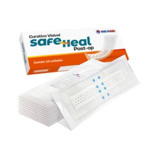Curativo visível safe heal post-op 10x30 5x25 1un kelogel Tamanho: 10x30cm O curativo visível safe heal post-op kelogel é um curativo estéril com design inovador que permite monitorar feridas sem trocas desnecessárias. É translúcido, maleável, impermeável e possui uma almofada de espuma em formato de colmeia para visibilidade. Sua aplicação é facilitada por tiras destacáveis e um filme de poliuretano.
