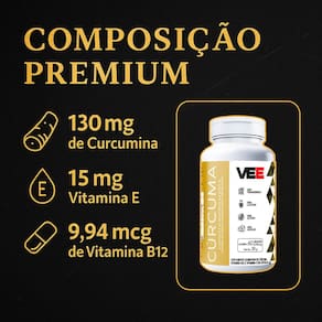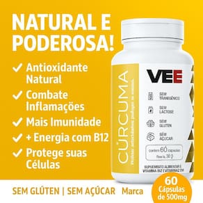 Potencialize sua saúde com a força da natureza! O Suplemento de Cúrcuma com Vitaminas B12 e E da VEE oferece uma combinação poderosa de ingredientes antioxidantes e anti-inflamatórios naturais para proteger seu corpo dos danos causados pelos radicais livres, fortalecer o sistema imunológico e promover bem-estar diário. Benefícios que você sente no dia a dia: • Combate inflamações naturais no corpo • Fortalece a imunidade • Ação antioxidante e antienvelhecimento • Mais energia com a vitamina B12 • Proteção celular com a vitamina E • Suporte às articulações e ao sistema digestivo