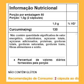 O Suplemento Alimentar de extrato de Cúrcuma Curcumina é uma combinação da cúrcuma desidratada com o extrato concentrado obtido das raízes. A porção de duas cápsulas reúne 100% das necessidades diárias de curcumina (130 mg de curcumina)