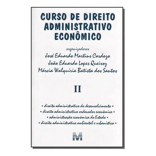 Título do livro : Curso de direito administrativo econômico - Volume 2 - 1 ed./2006 Autor : Cardozo, José Eduardo Martins Idioma : Português Editora do livro : Malheiros Editores LTDA Capa do livro : Mole Ano de publicação : 2006 Quantidade de páginas : 814 Altura : 210 mm Largura : 140 mm Peso : 800 g Gênero do livro : Direito, política e ciências sociais Subgêneros do livro : Direito Data de publicação : 01-12-2006