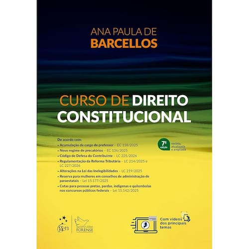 Este Curso apresenta um material abrangente, atual e claro que proporciona ao leitor uma compreensão aprofundada da Constituição de 1988 como um todo e das suas principais questões, considerando tanto o seu texto e sistema incluindo as alterações introduzidas pelas sucessivas emendas quanto a forma como eles têm sido interpretados e aplicados ao longo do tempo. A obra trata de conceitos fundamentais indispensáveis para a construção de um conhecimento sólido para, na sequência, conduzir o leitor por temas centrais da teoria da Constituição e, sobretudo, pelas várias partes do sistema organizado pela CF/1988 de forma específica. O Curso se ocupa dos princípios constitucionais e seus corolários, da teoria dos direitos fundamentais e do sistema organizado pela Constituição para a tutela de direitos, incluindo o exame dos direitos em espécie e das diretrizes e políticas públicas delineadas na ordem social. Este Curso de Direito Constitucional trata também da Federação brasileira, sua organização, as tensões e os critérios para a solução de conflitos; dos Poderes Executivo (incluindo a Administração Pública), Legislativo e Judiciário; além das funções essenciais à Justiça. O processo legislativo e as espécies legislativas são objeto de particular atenção nesse contexto. O texto prossegue com o estudo da ordem econômica e tributária, das mudanças introduzidas pela reforma tributária, e das normas que disciplinam o orçamento e as finanças públicas. Por fim, discute de forma sistemática os diversos mecanismos de controle de constitucionalidade atualmente existentes no País e sua aplicação na jurisprudência do Supremo Tribunal Federal. Marca: Não Informado