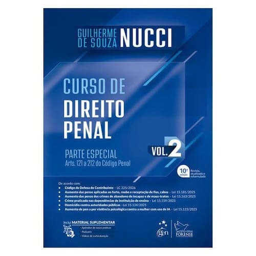 A coleção de três volumes abrange todo o currículo da disciplina, com análise de cada tipo penal aliada aos consagrados quadros esquemáticos e comparativos de crimes, que otimizam a compreensão. O texto legal é inserido nos capítulos de doutrina. As modificações legislativas ao longo de 2025 foram comentadas, assim como as decisões mais recentes dos Tribunais Superiores. Inclui apêndice de casos práticos, com sugestões de análise, debate e respostas acessadas por meio de recursos interativos, e acesso a podcasts e vídeos de curta duração, auxiliando na assimilação e na fixação de conteúdos selecionados. O Curso de Direito Penal é uma obra completa para todos os leitores: estudantes de graduação e de pós-graduação, concursandos e operadores do Direito. Em todas as suas obras, Guilherme de Souza Nucci busca incessantemente o ideal de inovação. Com sólido conteúdo acadêmico, a cada trabalho procura aprimorar o estudo das ciências criminais, acompanhando sua evolução e seu progresso, resultando em uma produção jurídico-literária de 38 títulos.