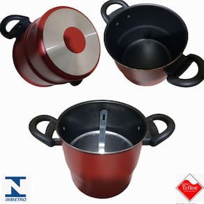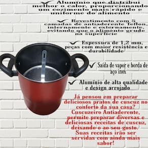 Características principais Marca Coisas & Trecos Modelo Cuscuzeiro N°16 Antiaderente Cor Preto , Cereja, Turquesa e Vermelho (Teflon Antiaderente) Outras características É kit: NÃO Descrição CARACTERÍSTICAS: Longa durabilidade; Não enferruja; Fácil higienização e manuseio; Simples, seguro e prático; Material do corpo em alumínio reforçado; Cor predominante: Preto Antiaderente , Cereja Antiaderente, Turquesa Antiaderente e Vermelho Antiaderente