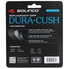 A Solinco é especializada no desenvolvimento e produção de equipamentos de tênis da mais alta qualidade e desempenho do mercado atualmente. Com mais de 30 anos de vasta experiência técnica dentro da equipe, comprometida e focada em continuar liderando o setor em tecnologias inovadoras apresenta Cushion Grip Solinco Dura Cush Preto desenvolvida para os tenistas que buscam maior performance do seu jogo.