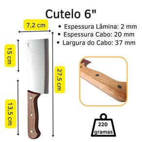 Cutelo Cabo Madeira Faca Inox Churrasco Açougue Cutelo Cabo de Madeira Lâmina de inox 6'' para , Açougueiros, Churrascaria, Cozinha e Restaurantes FICHA TÉCNICA - Pesado : 220g; - Tamanho total: 27,5 cm; - Cabo Madeira Anatómico: 13,5 cm; - Lâmina em inox Fulltang Monobloco - Inteira até o Final do Cabo - Espessura:20mm; - Comprimento: 15 cm 6 Polegadas ; - Largura: 7,2 cm; - Orifício na Lâmina para poder pendurar em Suporte, gancho ou Cinta. - Parte Superior espessa para amaciar a carne ou espremer alho; - Marca: SQ INDICAÇÃO: - Indicada para quebrar ou cortar ossos de suínos, aves, peixes e alimentos congelados. RECOMENDAÇÕES: - Mantenha a faca afiada. - Sempre guarde a faca seca. - ATENÇÃO: - Cuidado ao manusear produtos cortantes e perfurantes. - Guarde em local seguro. - Guarde em local seco, longe de umidade. - Guarde estas instruções para futuras consultas. - Manter fora do alcance das crianças. Marca: Não Informado