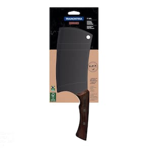 O cutelo Tramontina Churrasco Black com lâmina de aço inox escurecido e cabo de madeira 7 polegadas vai te ajudar naquela tarefa difícil de quebrar e separar os ossos da carne. Ele é produzido com lâmina de aço inox escurecido e cabo de madeira com rebites, ambas características que proporcionam alta resistência e durabilidade. Além disso, o cutelo possui um estilo diferenciado e vai agregar mais beleza ao seu momento! Orientações Ideal para quebrar e separar os ossos.Lâmina de aço inox escurecido. Resistente e robusta.Cabo de madeira com design anatômico que torna o uso muito mais confortável.Rebites aço inox escurecido. Características Gerais EAN13 7891112296848 DUN14 17891112296845 NCM 8214.90.90 Peso Líquido 0,4500 kg. Peso Bruto 0,4700 kg. Metragem 0,001158 m³. Dimensões Embalagem (Compr. X Larg. X Alt.) 140x 22x 376 mm. Dimensões Produto (Compr. X Larg. X Alt.) 320x 107x 22 mm. Observações Antes da primeira utilização, lave bem a peça e seque-a. Produto cortante e perfurante: tenha cuidado ao manusear e mantenha fora do alcance das crianças. Não utilize materiais abrasivos para limpeza e para maior durabilidade do produto recomenda-se secar bem antes de guardar. Não utilize em máquinas de lavar. Para descarte do produto e embalagem siga as orientações de reciclagem vigentes.