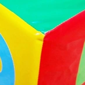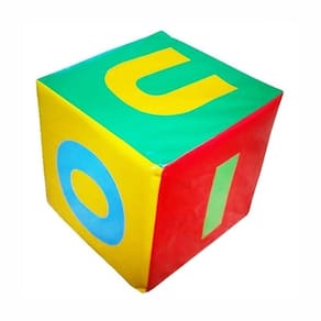 Dado feito de espuma de alta densidade, cada lado possui uma vogal, revestido em bagum brilhante.