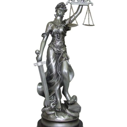 A Dama da Justiça é uma divindade grega por meio da qual a justiça é definida, no sentido moral, como o sentimento da verdade, da equidade e da humanidade, colocado acima das paixões humanas. Por este motivo, sendo personificada pela deusa Têmis, é representada de olhos vendados e com uma balança na mão.A Peça é feita de resina na cor prata ideal para decorar sua casa ou escritório ou presentear um amigo ou familiar que luta pela lei. Ficha técnica Comprimento: 8 cm Largura: 8 cm Altura: 21 cm Cor: Prata Material: Resina com base de madeira