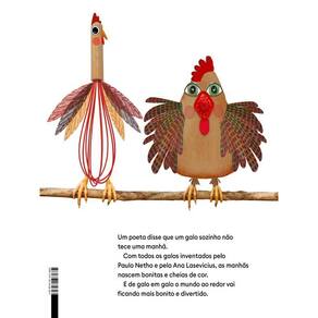 Um poeta disse que um galo sozinho não tece uma manhã. Com todos os galos inventados pelo Paulo Netho e pela Ana Lasevicius, as manhãs nascem bonitas e cheias de cor. E de galo em galo o mundo ao redor vai ficando mais bonito e divertido. Paulo Netho e Ana Lasevicius trocaram várias ligações poetizando as personalidades de amigos, vizinhos e moradores da cidade onde nasceu Paulo Netho. A partir da brincadeira de rimar, construíram os mais diversos galos, todos eles figuras reconhecíveis no nosso dia a dia! E tudo fica mais divertido com as ilustrações de Ana Lasevicius, criadas a partir de objetos domésticos.