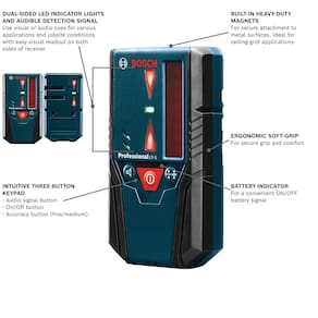 BOSCH a laser de feixe vermelho LR 6 de 165 pés, inclui suporte de montagem e 2 pilhas AAA - Durável: com estrutura robusta sobremoldada, o tem classificação IP54 e garante proteção contra respingos de água e poeira. - Indicador LED de dois lados: o indicador LED oferece fácil leitura visual em ambos os lados do . - Suporte de montagem de liberação rápida: o suporte permite que o seja anexado a uma haste de nivelamento. - Indicador de áudio ajustável: o dá um sinal claro de posicionamento na classificação e se ajusta aos níveis de ruído do local de trabalho. - Amplia o alcance de funcionamento: o detecta linhas de Bosch GCL 2-160 até 50 metros. - Ímãs resistentes: o pode ser fixado a superfícies metálicas.