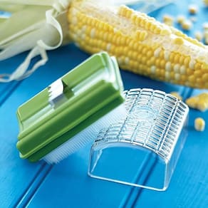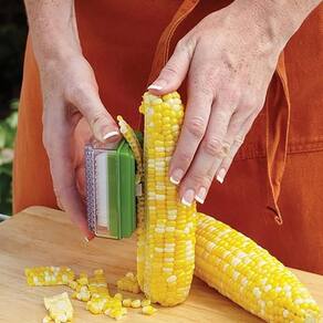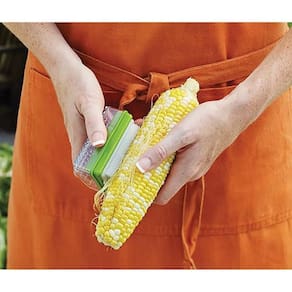 O removedor de milho 2 em 1 para fácil remoção de milho da Outset marca da renomada Fox Run descasca facilmente o milho e remove o grão, contém grande almofada flexível com cerdas, limpa facilmente.