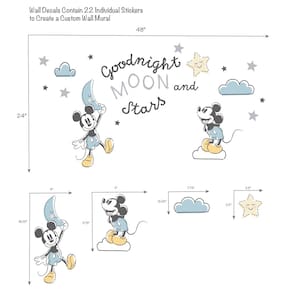 Complete seu charmoso berçário Moonlight Mickey com esses decalques de parede personalizados. Eles adicionarão um toque de design a uma parede característica no quarto do seu filho para criar uma aparência de mural. Existem 3 folhas de 12” X 18” com um total de 22 peças pré-cortadas. O tamanho final é de aproximadamente 24” X 48” quando aplicado conforme mostrado. Em destaque estão 2 Mickeys em shorts azuis, sapatos amarelos e luvas brancas, além de estrelas, nuvens, lua crescente e as palavras Goodnight Moon and Stars. Esses decalques são fáceis de aplicar e funcionam melhor em superfícies lisas. - Adiciona uma aparência de design ao quarto do seu filho - Inclui 3 lençóis de 12” x 18” com 22 peças pré-cortadas - Possui 2 Mickeys, estrelas, nuvens, lua crescente e palavreado - Esses decalques funcionam melhor em paredes lisas - Fáceis de aplicar e não danificam a superfície quando você os remove