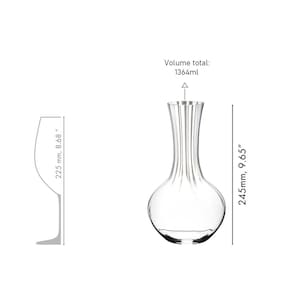 - Decanter: Medidas: 14 x 14 x 24,5cm Capacidade total: 1,364 litros Fabricante: Riedel Modelo: Performance Material: Cristal País: Áustria