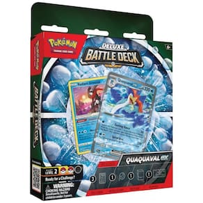 O Pokémon TCG: Meowscarada/Quaquaval ex Deluxe Battle Deck é um produto de baralho pronto para jogar que traz um deck temático de 60 cartas focado em um dos Pokémon ex: Meowscarada ex ou Quaquaval ex, enviado de forma aleatória em cada caixa. Cada baralho é estruturado com estratégia intermediária, voltada a jogadores que já dominam as regras básicas e desejam recursos adicionais como cartas de Treinador e Pokémon de suporte.