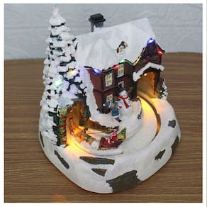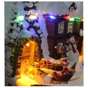 Caracteristicas: Possui lâmpadas de Led colorido que iluminam todo o cenário Possui movimento: Trenó. Material: Plático, Resina. 3 Pilha AA (não incluída)