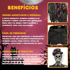 Combine o Noivo Esqueleto com outros itens temáticos de Halloween para uma ambientação completa e assustadora.