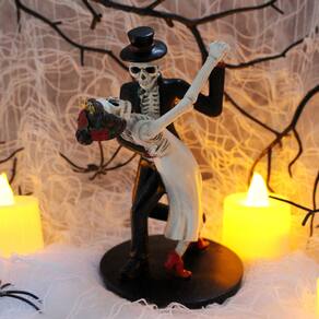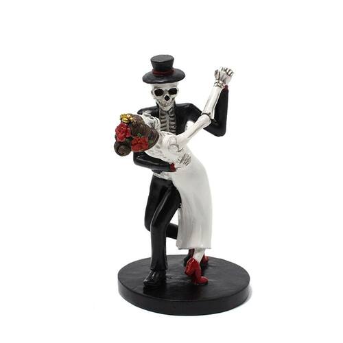 Material: resina Tamanho: 7,8* 6,7* 12 cm Peso: 160 g ['Design exclusivo de esqueleto — apresenta um casal de esqueletos dançarinos vestido de noiva e noivo, adicionando um toque de romance sombrio e humor à decoração de seu jardim gótico ou de Halloween. ', 'Material de resina durável — Feito de resina de alta qualidade que é resistente às intempéries, garantindo uso duradouro em ambientes internos ou externos sem desbotar ou rachar. ', 'Tamanho perfeito para exibição — Medindo aproximadamente 7,8 × 6,7 × 12 cm e pesando cerca de 160 g, esta escultura se encaixa perfeitamente em prateleiras, pátios, mesas de jardim ou vitrines na varanda frontal. ', 'Artesanato artístico — Acabamento detalhado pintado à mão com detalhes em vermelho vibrante em sapatos e flores, criando uma figura decorativa vívida e atraente. ', 'Peça de decoração versátil — Estátua ideal para enfeites de jardim, decoração de casa, cantos de pátios ou como peça central durante o Halloween e celebrações temáticas.']