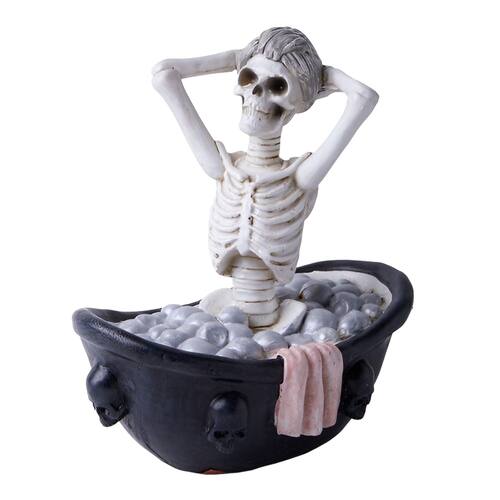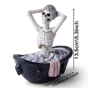 Material: Resina Tamanho: 10,5 cm × 13,5 cm Peso: 208 g ['Design exclusivo de banho de esqueleto — Esta escultura criativa de resina apresenta um esqueleto relaxando em uma banheira adornada com caveiras, adicionando um toque humorístico e assustador à decoração do jardim ou da casa. ', 'Material de resina de alta qualidade — Feita de resina durável e resistente às intempéries, esta estátua de figura é adequada para uso interno e externo, mantendo sua cor e textura por anos. ', 'Artesanato detalhado — Pintado à mão com tons de osso realistas e detalhes em estilo gótico, cada enfeite traz detalhes intrincados que aprimoram sua exibição assustadora. ', 'Perfeita para decoração de Halloween — Ideal para pátios, jardins, mesas ou entradas, esta escultura cria uma atmosfera divertida e misteriosa de Halloween para o seu espaço. ', 'Design compacto e estável — Medindo 10,5 × 13,5 cm, esta figura de resina fica firme em superfícies planas, facilitando a colocação em mesas, prateleiras ou pedras de jardim para uma decoração criativa.']