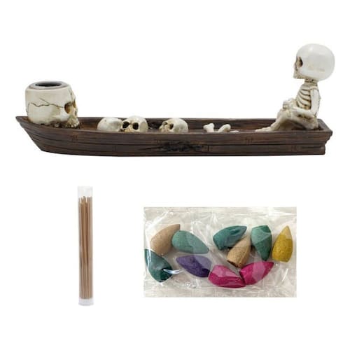 Material: Resina Tamanho: 16,8* 3,9* 5,3 cm Peso: 185 g ['Creepy Skeleton Boat Design — Apresenta um barco a remo cheio de caveiras e um esqueleto de pescador sentado, criando uma estética de terror arrepiante para exibições temáticas. ', 'Porta-incensos de dupla finalidade — Inclui espaço para colocar cones ou palitos de incenso, combinando decoração misteriosa com difusão funcional de aromas. ', 'Construção durável em resina — Feita de resina resistente, esta estátua é adequada para prateleiras internas, pátios, entradas ou jardins de Halloween. ', 'Artesanato altamente detalhado — Texturas realistas do crânio, design de barco envelhecido e figuras assustadoras aprimoram a atmosfera assustadora em qualquer ambiente. ', 'Perfeito para cenas de Halloween — Ideal para decoração assombrada, coleções góticas ou peças centrais macabras, adicionando um caráter dramático aos arranjos sazonais.']
