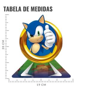 A Decoração de Mesa Sonic é um produto de qualidade nos materiais e alta qualidade de impressão para deixar sua festa ainda mais linda. Ela vem em um modelo com uma base de display de fácil montagem com anéis que são principais do jogo com um fundo da Green Hill Zone e em cada um dos totens um dos personagens principais sendo eles o Sonic, Tails, Knuckles e Amy Rose.