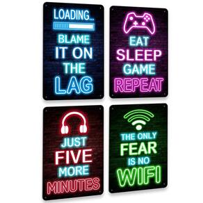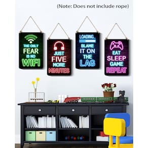 - 1. Decoração de jogos vibrante e divertida - Ilumine qualquer espaço de jogo com este conjunto de 6 placas de metal inspiradas em neon. Perfeita para quartos de meninos, salas de jogos ou salas de jogos, essas peças de decoração de parede de jogos coloridas e dinâmicas trazem uma vibração emocionante a qualquer espaço.