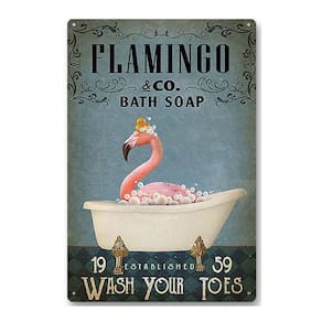 Pintura em ferro estilo vintage com design de flamingo em uma banheira. Impressão de alta definição, resistente ao desgaste e durável. Possui orifícios pré-perfurados para fácil instalação.Tipo