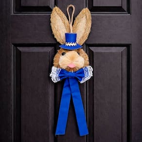 Decoração Páscoa Pendente Cabeça Coelho Com Laço Palha 40cm Azul -