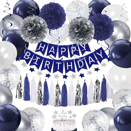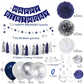🎁 Especificações Material: balões e papel de látex e confetes Cor: azul marinho, prata, branco Tamanho individual: 30,5 cm de diâmetro Observação: Suporte de ar e hélio A embalagem inclui: ? Banner de "Aniversário Feliz" (1 conjunto); ? Topo de bolo DIY prateado (1 conjunto); 6 pompons de papel; 6 peças de redemoinho de festa; ? Guirlanda de estrelas (2 metros); 15 peças de guirlanda de borlas de papel; 10 balões de látex azul marinho (30,5 cm); 10 balões de látex branco pérola (30,5 cm); 5 balões de látex prateados metálicos (30,5 cm); 5 balões de confete prateados (30,5 cm); 1 rolo de fita de balão; Dicas: Não aplique pressão pesada para manter o balão perto de altas temperaturas, objetos pontiagudos, e encha muito ar ou hélio, eles podem estourar imediatamente. - Decoração de aniversário com tema azul marinho e prata: eleve sua festa de aniversário com nosso kit de decoração elegante, apresentando um esquema de cores refinado azul marinho, prata e branco. É a base perfeita para celebrações, adequada para decorações de aniversário de 16, 20, 21, 25, 29, 30, 40, 50, 70 anos - ?Conjunto de faixa chique de feliz aniversário?- Decore seu evento com nosso banner premium, com bandeiras de tamanho de 11,4 x 16,8 cm, amarradas em uma elegante fita de cetim azul. O conjunto é acentuado com um conjunto de topo de bolo e uma guirlanda de estrela de 2 metros, combinando tons de azul marinho e prata para uma exibição deslumbrante. - ?Coleção diversificada de balões de feliz aniversário?- Este conjunto inclui 30 balões de látex de longa duração medindo 30 cm cada, em azul marinho, branco e prata metálica, além de padrões cativantes de confetes, completos com uma fita de 10 metros para um arranjo elegante. - ?Pompons de tecido e redemoinhos?- Adicione dimensão com 6 pompons de tecido fáceis de montar (25 cm) e redemoinhos de festa combinando, em nosso trio de cores, perfeito para criar uma atmosfera de festa de alto impacto. - ?Guirlanda de borla perfeita?- termine sua decoração com uma guirlanda de borla de 15 peças em azul marinho, branco e prata — uma adição simples, mas impressionante que une todo o tema sem esforço.