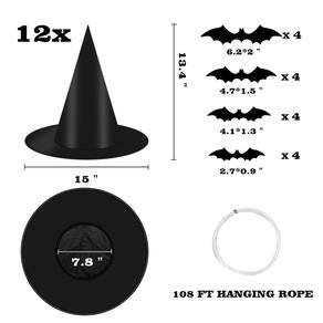 O pacote inclui: 12 chapéus de bruxa pretos, 16 peças de morcegos 3D, uma corda pendurada de 33 m/109 pés e uma agulha.