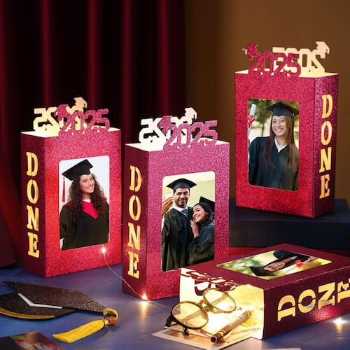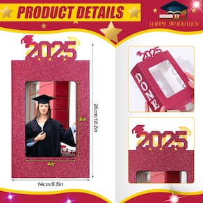 Desfrute de molduras de formatura feitas de papel vermelho com glitter. Estas molduras não são apenas duráveis, mas também fornecem um brilho atraente que melhora suas fotos de formatura. Além disso, eles adicionam um toque refinado à sua decoração de formatura, tornando sua celebração ainda mais memorável.