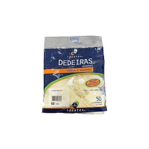 Dedeira de Látex Ideatex Nº4 50 Unidades Dedeira extra fina n.04 no tamanho 28mm x 75mm . Material as luvas de procedimento. Dedeira confeccionada em látex de borracha natural, lisa, não estéril, para proteção dos dedos de usuários expostos a agentes biológicos em trabalhos diversos, que requeiram tato, como: no manuseio de matéria-prima e produto acabado. Uso único para maior higiene e segurança. Descartar após o uso. As dedeiras de látex têm o objetivo de proteger os usuários nos procedimentos que envolvam atividades manuais com riscos de contaminação, pois previne o contato direto da extremidade dos dedos com os materiais .