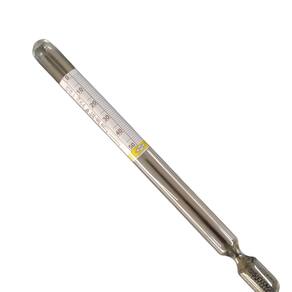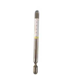 O densímetro modelo Baumé para salmoura é um instrumento de medição utilizado para determinar a densidade relativa de soluções salinas, como salmoura, em escala de 0 a 50 °Bé (graus Baumé). Fabricado em vidro transparente, este dispositivo de medição funciona por imersão direta no líquido e fornece leitura imediata por meio de uma escala graduada no interior do tubo.