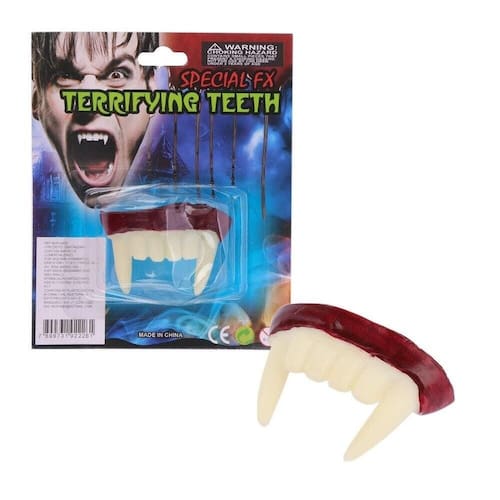 Dentadura de Vampiro Halloween Silicone - Variedades de Halloween em escolhas entre decoração, fantasias, enfeites, utensílios e muito mais;\n- Dentadura de vampiro em silicone, tamanho único ajustável;\nEspecificações:\nMarca : NYR\nTipo de material : Silicone\nCores ou Estampa : Branco\nDimensões do Produto : 3 X 5 X 1,5 CM\nDimensões da Embalagem : 13,5 X 11 X 3 CM\nPeso Bruto (Gramas) : 0.012