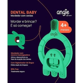 O novo Dental Baby Angie é um mordedor infantil com cerdas de silicone que lhe auxiliará a estimular o hábito da higiene bucal do a seu bebê e aliviar o desconforto da erupção dentária, a partir dos 4 meses de idade.