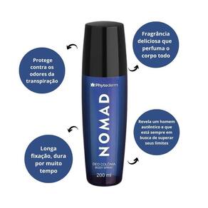 O Body Spray Nomad de Phytoderm além de perfumar o corpo todo, ainda tem ação desodorante que que protege contra os odores da transpiração. A fragrância tem saída fresca e notas cítricas, que se complementam com um fundo amadeirado de sândalo e âmbar. Nomad revela um homem autêntico e que está sempre em busca de superar seus limites.