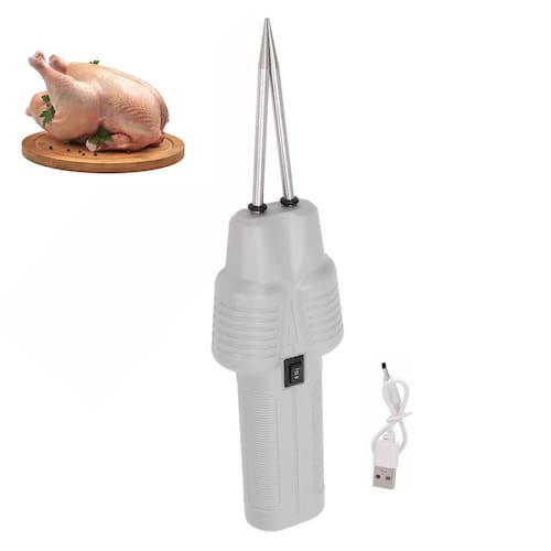 É portátil, possui cabeçote de alta fricção, ajuste automático de aperto, rotação de alta velocidade, depenagem rápida, sem danos à carne.