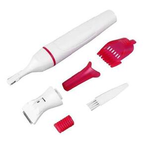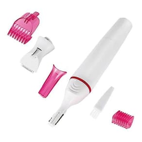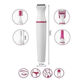 Mini depilador elétrico portátil depilação feminina 5 em 1 O aparador permite uma maneira simples e sem dor para aparar pelos no corpo Existem 4 aparadores removíveis que permitem aparar os pelos de diversas partes do seu corpo incluindo coxas axilas costas peito sobrancelhas pelo do nariz e orelha e área do biquíni Um aparelho com 5 funções Lâmina lavável, fácil de limpar Necessita de uma pilha aa não inclusa
