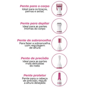 Prático e pode ser levado pra qualquer lugar. Suas 5 cabeças diferentes podem ser usadas para aparar sobrancelhas, virilha, narinas, axilas e face.