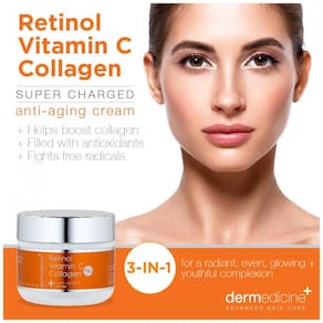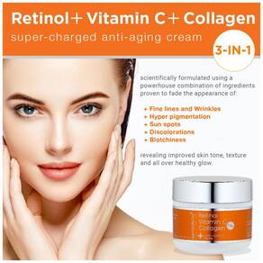 3 em 1 SUPER FÓRMULA PARA ILUMINAR Nosso creme facial tópico contém uma mistura de ingredientes clinicamente comprovados para combater os sinais de envelhecimento. Retinol, vitamina C e colágeno trabalham juntos para ajudar a reduzir a aparência de pele danificada, hiperpigmentação, descolorações, manchas escuras da idade e do fígado, manchas solares, pigmento associado a hormônios, pílulas anticoncepcionais e exposição diária ao sol, bronzeamento, erupções hormonais adultas , gravidez. Esta mistura potente também deixa a pele sedosa e macia.