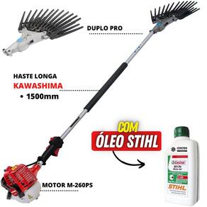 Derriçadeira Premium Kawashima KWD2610DL com Haste Longa 1500mm Motor Kawashima 25,6cc e Kit Duplo Pro + Óleo Castrol Stihl 500mlASSISTÊNCIA TÉCNICA EM TODO TERRITÓRIO NACIONALPRODUTO COM 6 MESES DE GARANTIACOM NOTA FISCALFORTE E ECONÔMICAROBUSTA E COM ESTRUTURA RESISTENTEPEÇAS DE REPOSIÇÃO DE FÁCIL ACESSOEQUIPE DE PÓS VENDAS A DISPOSIÇÃOO braço mecânico do agricultor, a Derriçadeira de Café Premium Kawashima KWD2610DL, foi desenvolvida para alto desempenho em agilizar e facilitar o trabalho e custos da colheita de café a Linha Premium é equipada com a melhor relação custo benefício. Conta com motor Kawashima Plus de 2 tempos a gasolina e tanque de combustível com capacidade para 0,8L. ESPECIFICAÇÕES TÉCNICAS: Tipo: LateralDiâmetro da Haste: 25mmComprimento da Haste: 1500mm (150cm) LongaEixo cardã: 7x7Modelo do kit derriçador: KD 257-DRelação: 1:3,8Garras: 24 (2x12)Curso de êmbolo: 10mm Motor: Kawashima Plus M 260-PSTipo do motor: 2 tempos, gasolinaCilindradas: 25,6ccTipo de Carburador: Diafragma, com regulagem Combustivel: Gasolina e óleo 2T (25:1)Capacidade do tanque de combustível: 0,8 LItens Inclusos: 1 Haste Kawashima Premium, 1 Kit Derriçador Nakashi KD 257-D, 1 Motor Kawashima Plus M 260-PS, 1 Manual de Instrução e 1 Óleo Stihl. Informações Adicionais:A DERRIÇADEIRA É DA MARCA KAWASHIMA, E ACOMPANHA UM ÓLEO 2T DA MARCA CASTROL STIHL.A medida de utilização do Óleo Castrol Stihl com a Derriçadeira Kawashima é de 25:1ANTES DE USAR O ÓLEO É NECESSÁRIO A VERIFICAÇÃO DA DOSAGEM CERTA PARA SUA MÁQUINA, CADA MÁQUINA POSSUÍ UMA DOSAGEM DIFERENTE, CASO CONTRÁRIO PODE ACARRETAR AO MAL FUNCIONAMENTO DA MÁQUINA E ATÉ FUNDIR SEU MOTOR. VERIFIQUE NO MANUAL DE SUA MÁQUINA. Este lubrificante possui um elevado poder detergente, que evita o acúmulo de resíduos de carbono, além de:Limpeza mais efetiva do motor Reduz o acúmulo de resíduos de carbono, assim como a formação de vernizes e de lacas, na zona dos anéis do pistão, reduzindo o risco de travamento do motor.Aditivação anticorrosiva, protegendo as partes internas do motor.Ação antidesgaste Maior proteção contra o desgaste das partes móveis dos motores, mesmo em situações severas de uso.Formação de cinzas. Sua tecnologia exclusiva evita a formação de cinzas na cabeça do pistão, na janela de exaustão e nas velas, e prevenindo a pré-ignição.