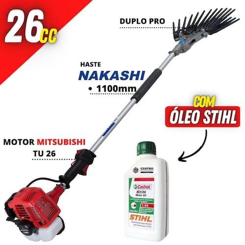 Itens Inclusos: 1 Haste Profissional Nakashi, 1Kit Derriçador Nakashi KD 257-D, 1 Motor Mitsubishi TU26, 1Manual de Instrução e 1 Óleo Stihl.