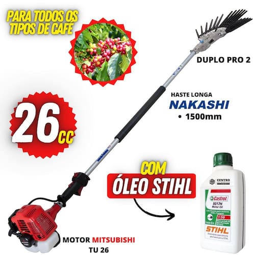 Itens Inclusos: 1 Haste Profissional Nakashi, 1Kit Derriçador Nakashi KD 257-D2, 1 Motor Mitsubishi TU26, 1Manual de Instrução e 1 Óleo Stihl.