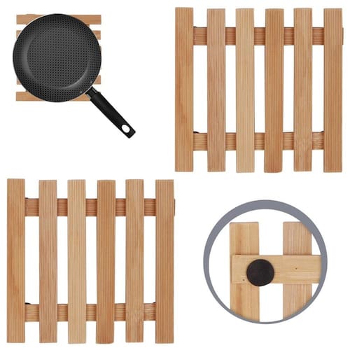 - Design ripado funcional: Permite melhor dissipação de calor e proteção das superfícies. - Madeira de alta qualidade: Material resistente e durável, com acabamento rústico e elegante. - Compacto e prático: Fácil de guardar e transportar, perfeito para uso diário.
