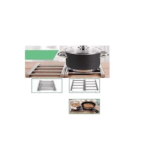 Descanso em aço inox Seguro: protege toalhas e superfícies Extensível: suporta até duas panelas pequenas Prático: fácil de usar e guardar Aberto mede: 20cm x 37cm Fechado mede: 20cm x 22cm Limpeza: utilize água, sabão neutro e esponja não abrasiva. Ficha técnica - Cor: Inox