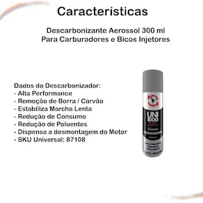 O Descarbonizante Uni1000 foi desenvolvido para limpar e desobstruir TBI/Corpo de Borboleta, Carburadores, Válvulas e Câmara de Combustão, removendo a carbonização, dissolvendo com facilidade óxidos e outros elementos que obstruem as passagens do sistema de alimentação de ar do veículo.