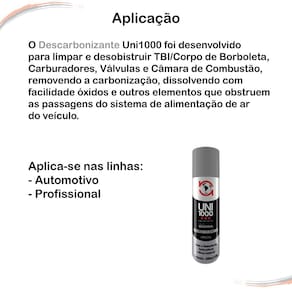 O Descarbonizante Uni1000 foi desenvolvido para limpar e desobstruir TBI/Corpo de Borboleta, Carburadores, Válvulas e Câmara de Combustão, removendo a carbonização, dissolvendo com facilidade óxidos e outros elementos que obstruem as passagens do sistema de alimentação de ar do veículo.