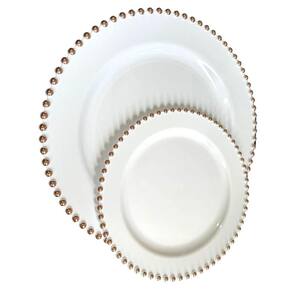Pratos refeição descartáveis luxo rose borda bolinhas rose 12 unid. Prato de natal réveillon jantar, almoço ou petiscos + 12 pratos de sobremesa Branco com detalhes nas bordas rose