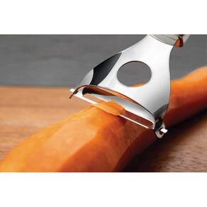 Ao preparar receitas especiais ou aquele almoço do dia a dia, o Descascador de Legumes Tramontina Marffim em Aço Inox é item indispensável na cozinha! Isso porque o produto permite que você descasque legumes com muito mais rapidez, segurança e precisão. O utensílio é produzido totalmente em aço inox, oferecendo assim muito mais resistência e durabilidade ao fio de corte. A escolha ideal para cozinhar com mais facilidade, é com a Tramontina! Totalmente feita de aço inox, por isso não solta nenhum resíduo nos alimentos, mantendo-os saudáveis. Altamente durável, mantém suas características originais, preservando a beleza, a higiene e a durabilidade do material. Pode ser lavada diariamente na máquina de lavar louças. Observações Use apenas sabão ou detergente e uma esponja macia. Outros tipos de produto como palha de aço, poderão riscar ou prejudicar o brilho da peça. Enxágue cada item a fim de remover totalmente os resíduos dos produtos de limpeza, que, por serem abrasivos, podem danificar o inox. Sempre que possível, use água quente, pois renova o brilho da peça. Após a lavagem, enxugue imediatamente a peça, caso contrário, as substâncias químicas da água (cloro) poderão causar manchas. Evite atrito entre as peças durante o processo de lavagem e no armazenamento, para mantê-la sem riscos. Evite o contato do produto com superfícies quentes, pois elas provocam a descoloração do material. Não guarde a peça em locais úmidos. A umidade também provoca manchas. Características Gerais EAN13 7891116157930 DUN14 17891116157937 NCM 8205.51.00 Peso Líquido 0,0680 kg. Peso Bruto 0,0780 kg. Metragem 0,000557 m³. Dimensões Embalagem (Compr. X Larg. X Alt.) 232x 80x 30 mm. Dimensões Produto (Compr. X Larg. X Alt.) 182x 59x 18 mm.