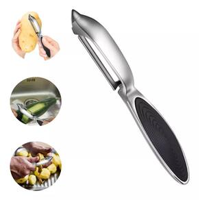 O descascador é feito de cabo de inox com silicone, e a lâmina afiada de aço inoxidável. Tamanho perfeito, fácil de segurar, confortável para descascar legumes, batatas, maçãs, abóboras, pepinos e outros alimentos.